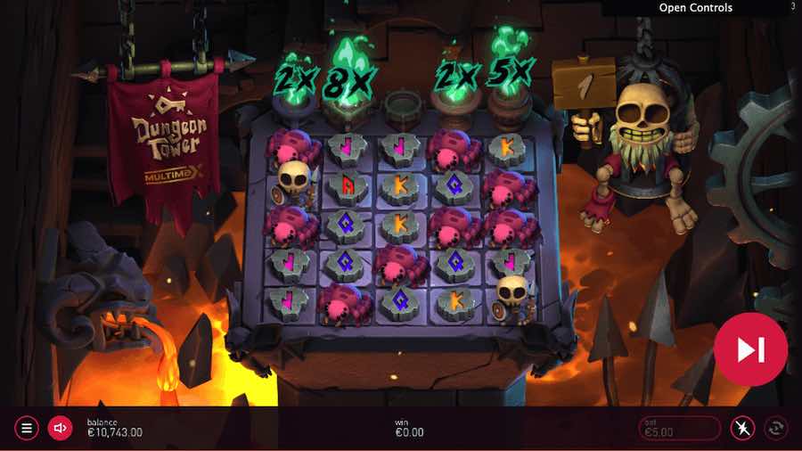 The base game of Dungeon Tower has a unique feel to it each time you hit the spin button, all of the symbols on the grid will sink down into their position before new symbols rise up in their place. This is functionally no different to actual reel strips, but it sure looks cool! You will probably be confused about what is happening with the random wilds popping up everywhere as you spin this 5×5 playfield slot, so we’ll try and explain how it all works for you below.