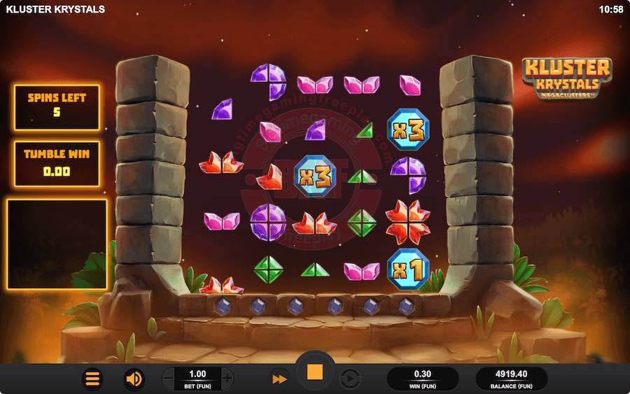 Whilst playing the game, you will notice that a bonus symbol can also drop into view on the play grid. This has a total of 4 segments, with between 1 – 3 of these potentially being filled when the symbol initially lands. For the free spin feature to trigger, all 4 segments of the bonus will need to be complete. You upgrade this symbol in the same fashion as the crystals are uPGarded in the base game. So each time the bonus is adjacent to a winning connection of crystals, an additional segment will be filled.